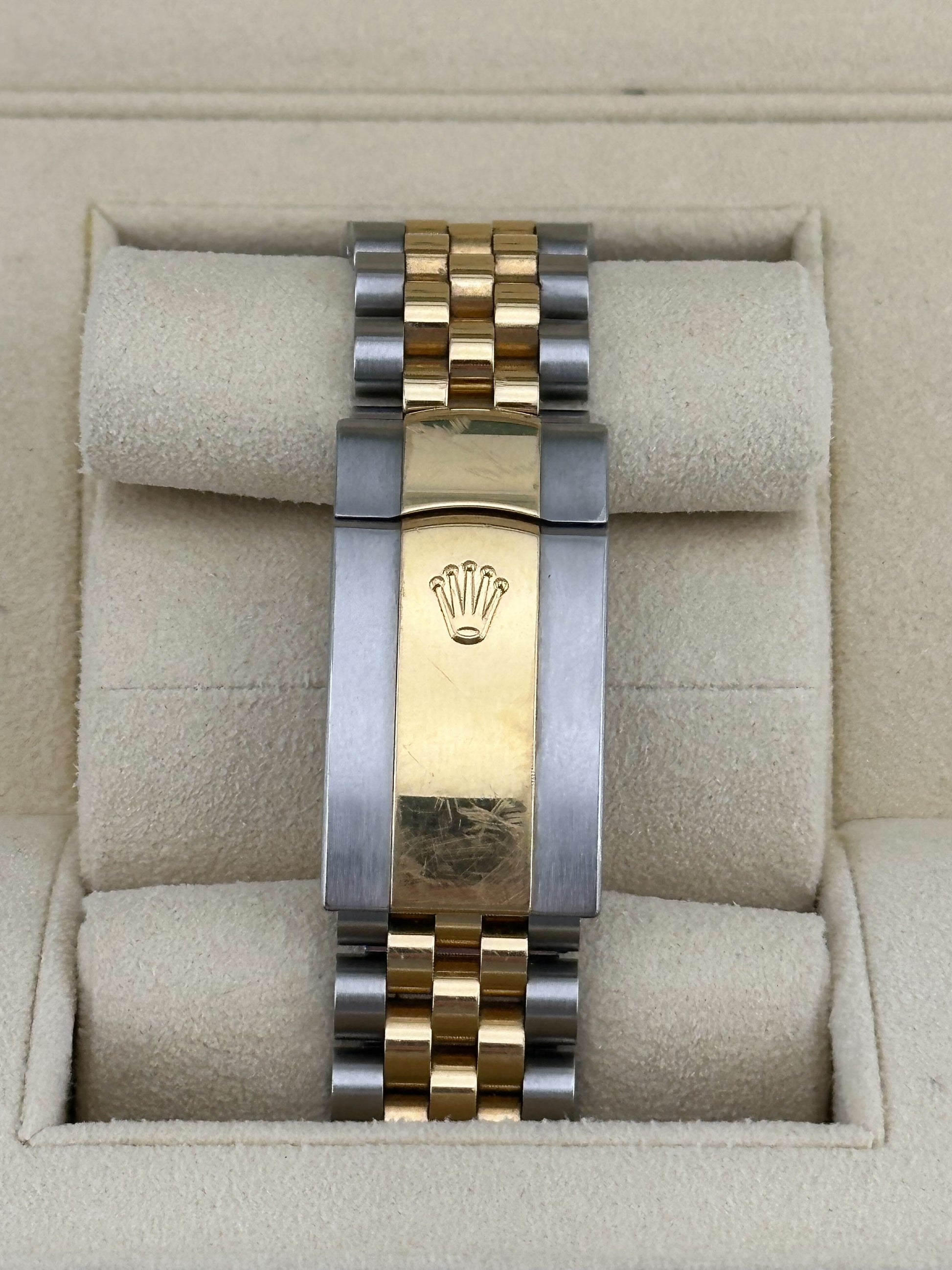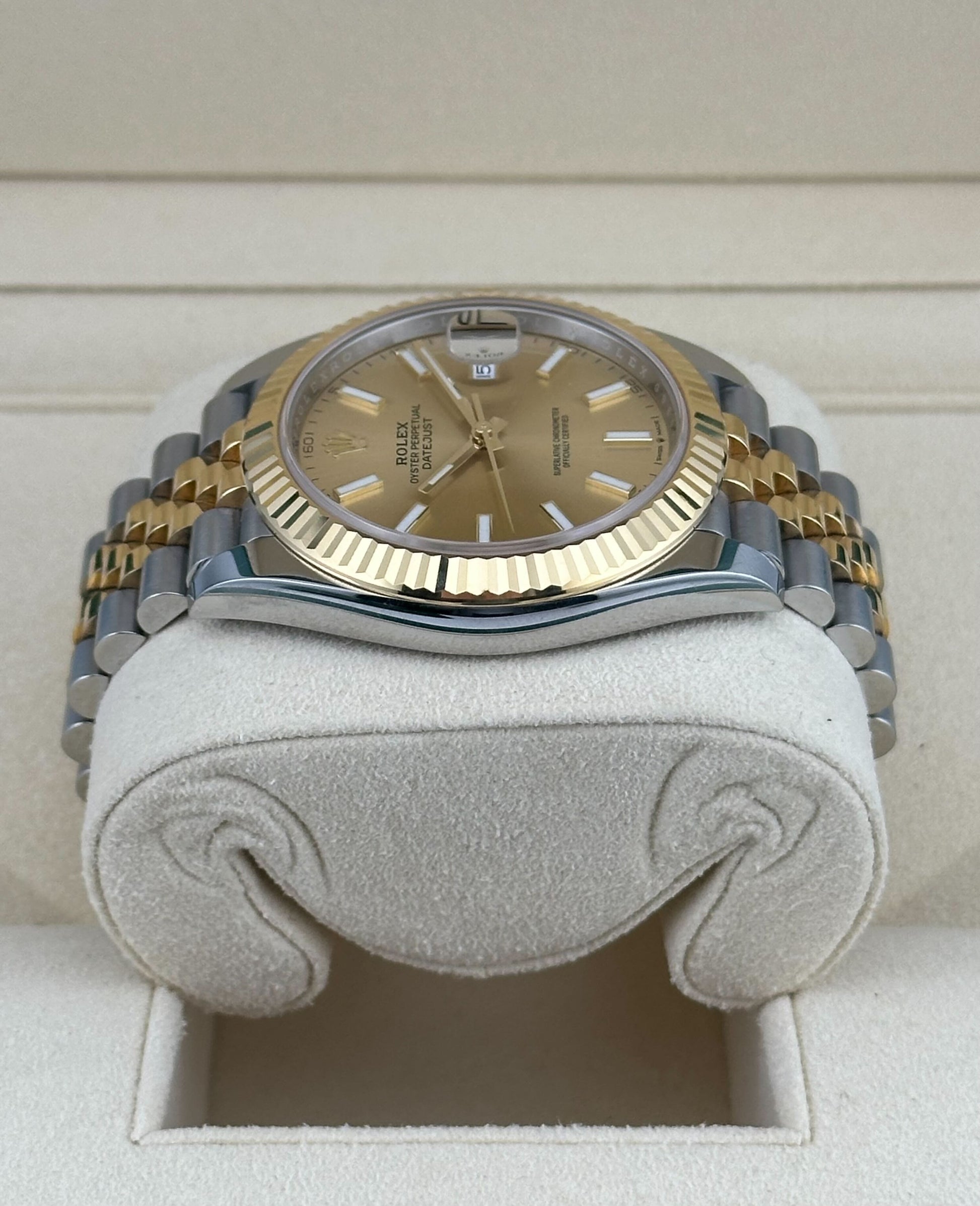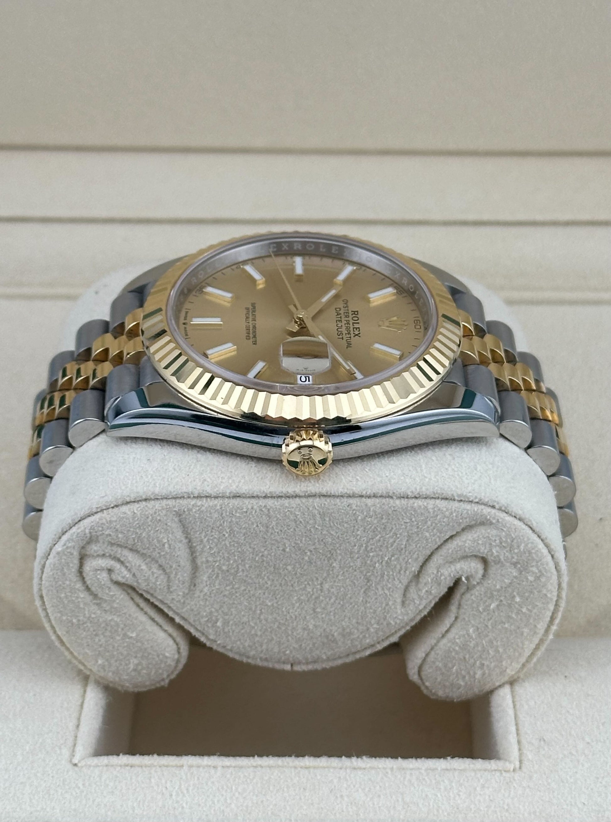 The 2025 Watch Datejust is designed with a 41mm stainless steel case. highlighted by the signature 18k yellow gold fluted bezel. It features an elegant champagne color dial with luminous hour markers and white gold hands with a date display at 3 o'clock. protected by a scratch-resistant sapphire-crystal. On the wrist the 18k white gold and stainless steel jubilee bracelet is a true beauty.