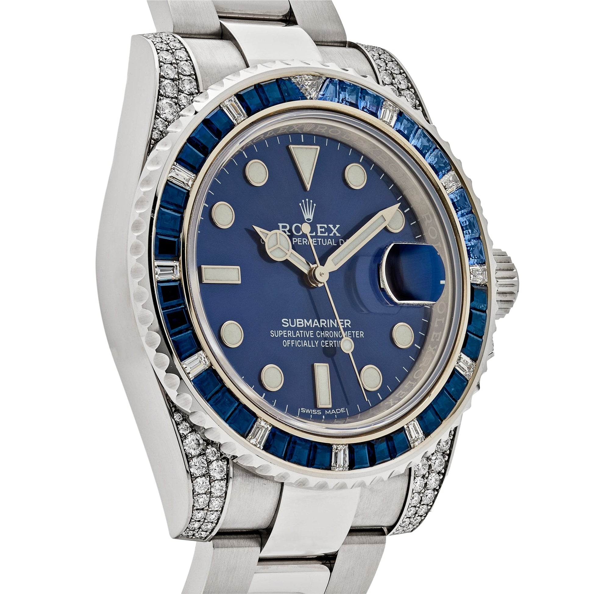 The 2025 Watch Submariner Date is designed in a 40mm 18k white gold case. blue dial. blue gem-set bezel. and styled on a white gold Oyster bracelet. Dark blue sapphires and diamonds cover the bezel and lugs. Luminous hour markers and hands make it easy to read in any condition -? so you can wear this beauty from dawn to dusk.