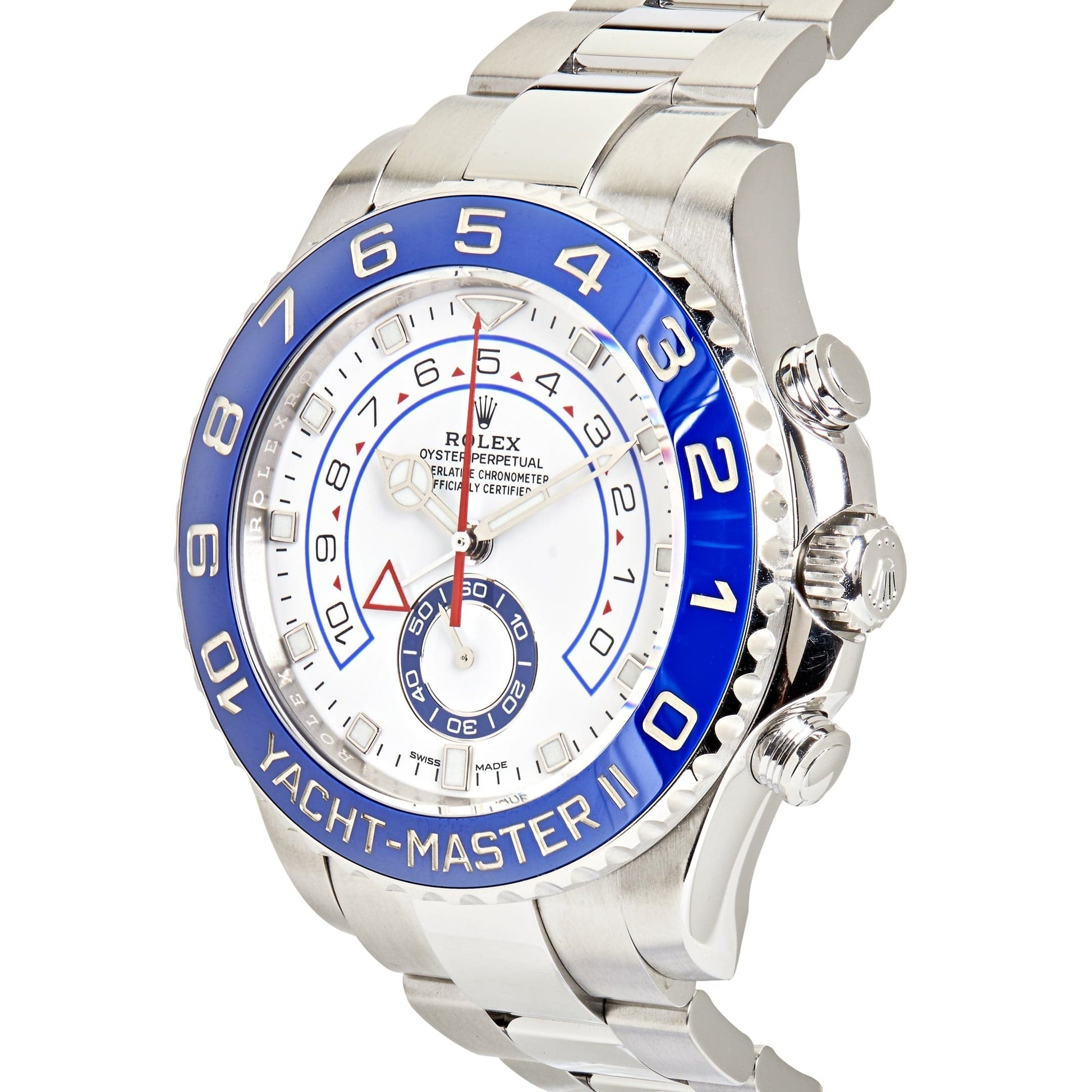 The 2025 Watch Yacht Master ll is designed in a 44mm stainless steel case with a bidirectional 90 degree rotatable blue and steel bezel. It features a white dial with white luminous hour markers. minute markers around outer rim. red second hand and small seconds sub-dial and date display. This bold beauty is housed on an Oyster bracelet intergrated with an Oysterlock safety clasp.?