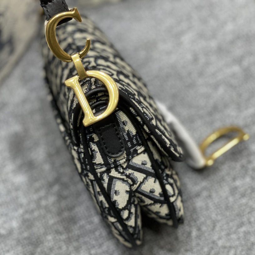 - The iconic saddle bag. Fully embroidered with the house's signature logo, this style features a "saddle" flap with a magnetic "D" closure in the shape of a saddle and antiqued gold accents on either side of the handle. The metal "CD" logo complements the legendary logo in style. Wear it as a tote or shoulder bag, or customize it with the optional shoulder strap.