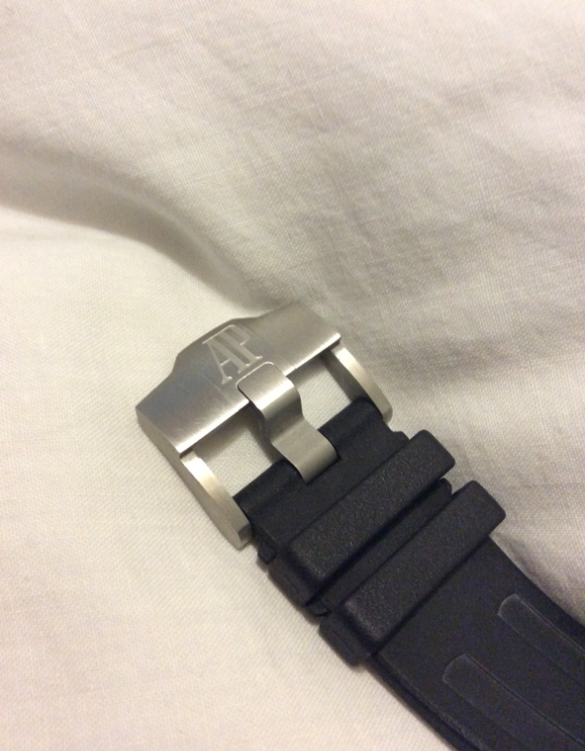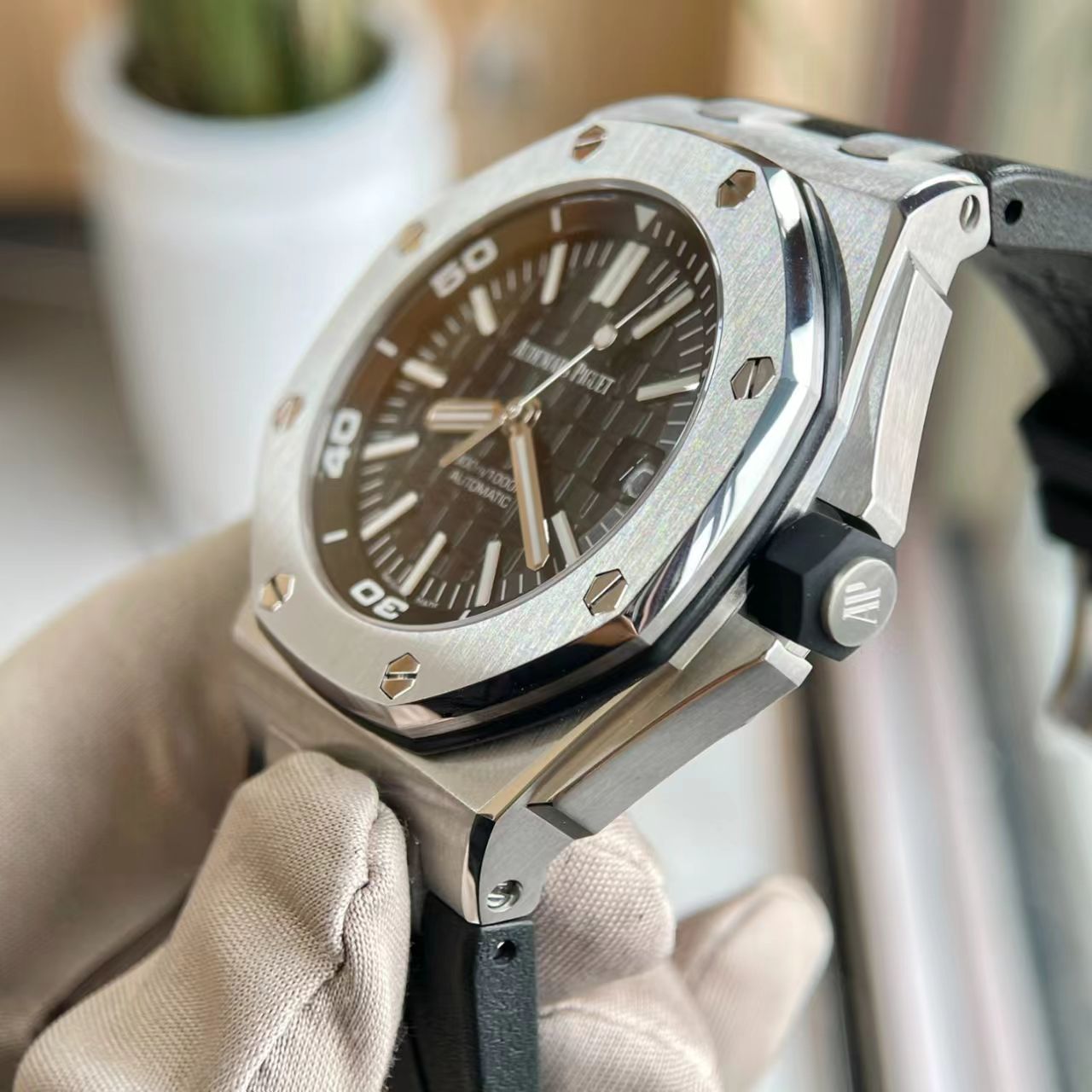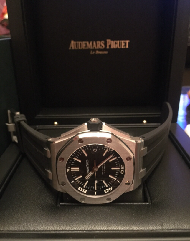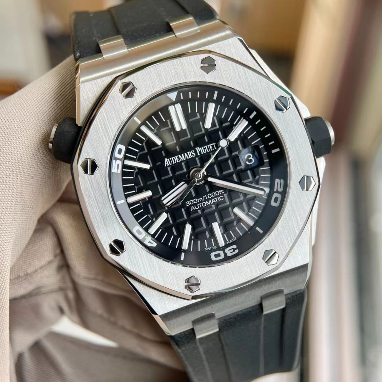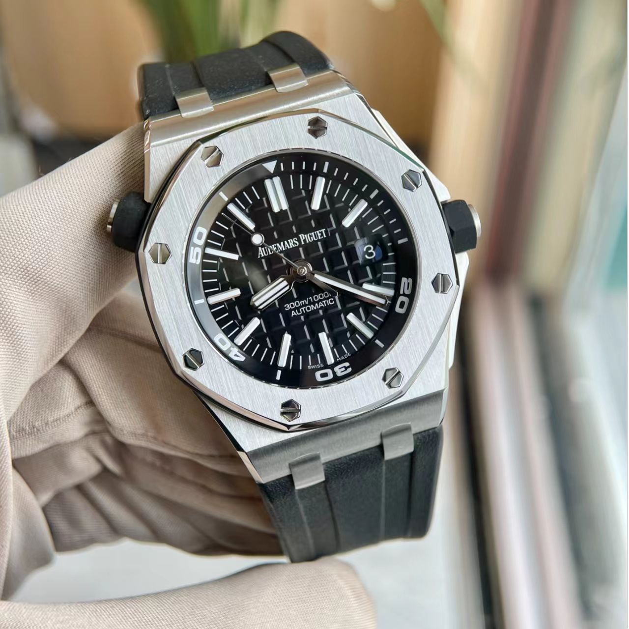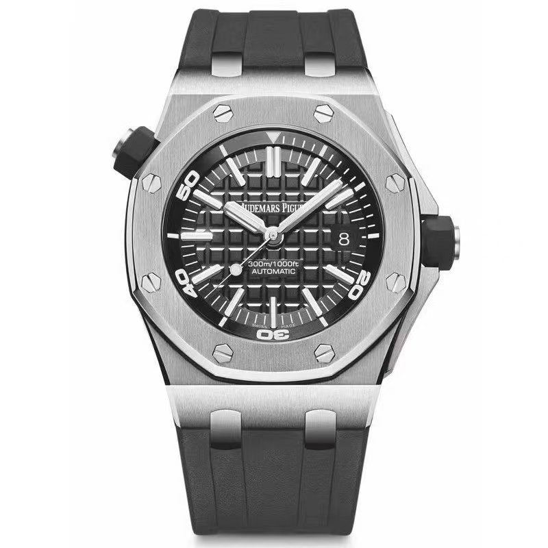 Dial Material: Black dial with "Méga Tapisserie" pattern, white gold applied hour markers and Royal Oak hands with luminescent coating, black rotating inner bezel with diving scale and 60- to 15-minute zone.