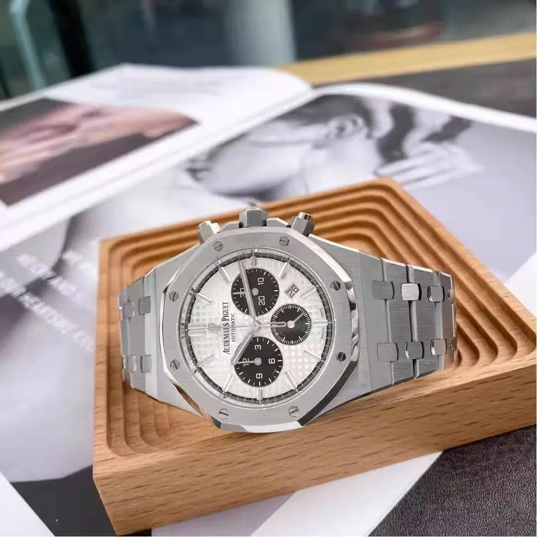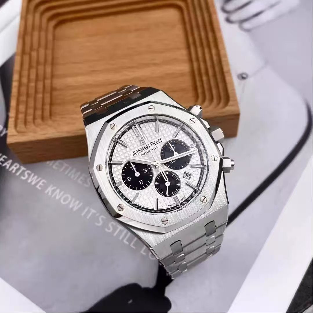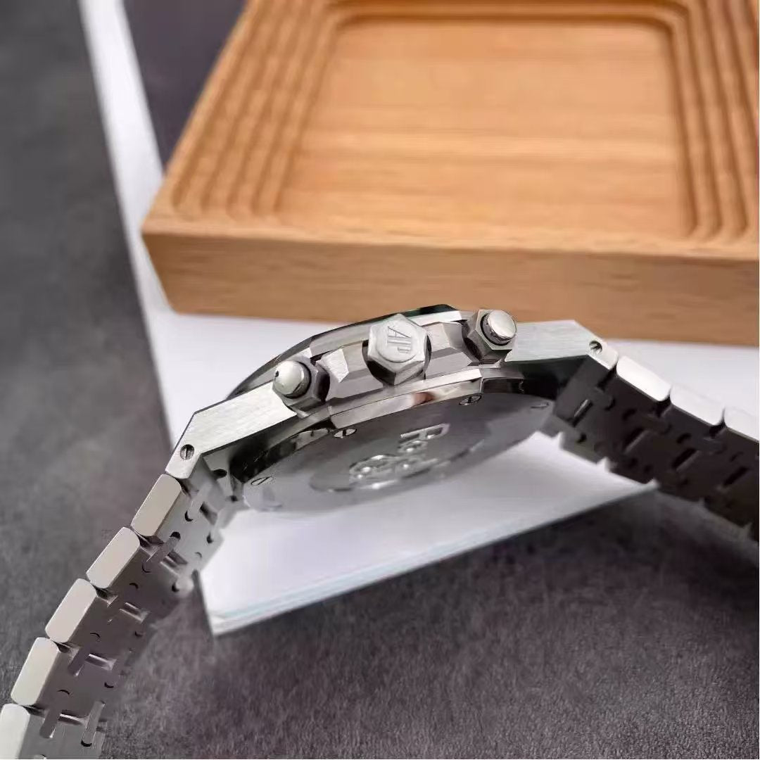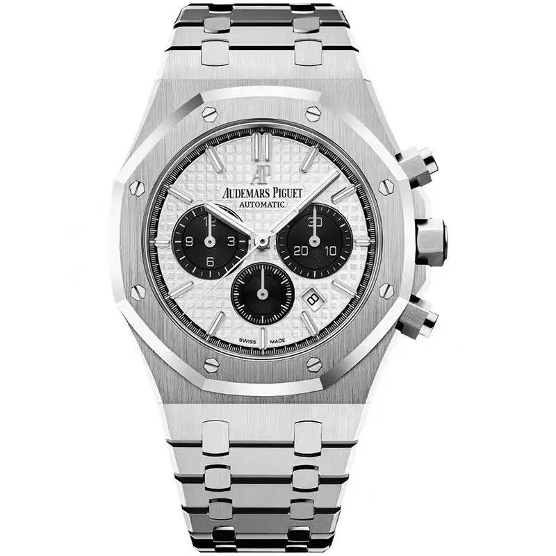 Dial Material: Silver dial with "Grande Tapisserie" pattern, black subdials and outer zone, white gold applied hour markers and Royal Oak hands with luminescent finish